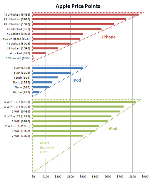 자 이제 녹색 iPad 가격대를 살펴보면, 우리는 iPad를 399불에 풀고 Price Umbrella로 사용하고 있는것을 볼 수있습니다. 하지만, 199불에서 399불사이에 해당하는 가격범위를 커버할 수 있는 제품이 필요한것이 분명한것으로 보입니다. 애플은 아마도 이범위안에 아이패드 미니를 넣을 수도 있다는 생각이듭니다.