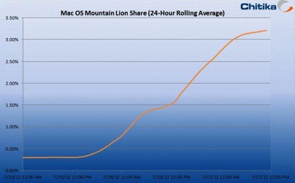 Allthings D에 따르면, 런칭한지 48시간 밖에 지나지않은 마운틴 라이언이 이미 맥에서 사용되는 웹 트래픽 중 3%이상을 차지하고 있다고 전했습니다. 통계회사인 Chitika에저 제공한 데이터를 보면, 마운틴라이언의 공식 런칭에 앞서 시장점유율은 대략 0.25%로써 빠르게 증가하고 있는것을 보여주고 있습니다.